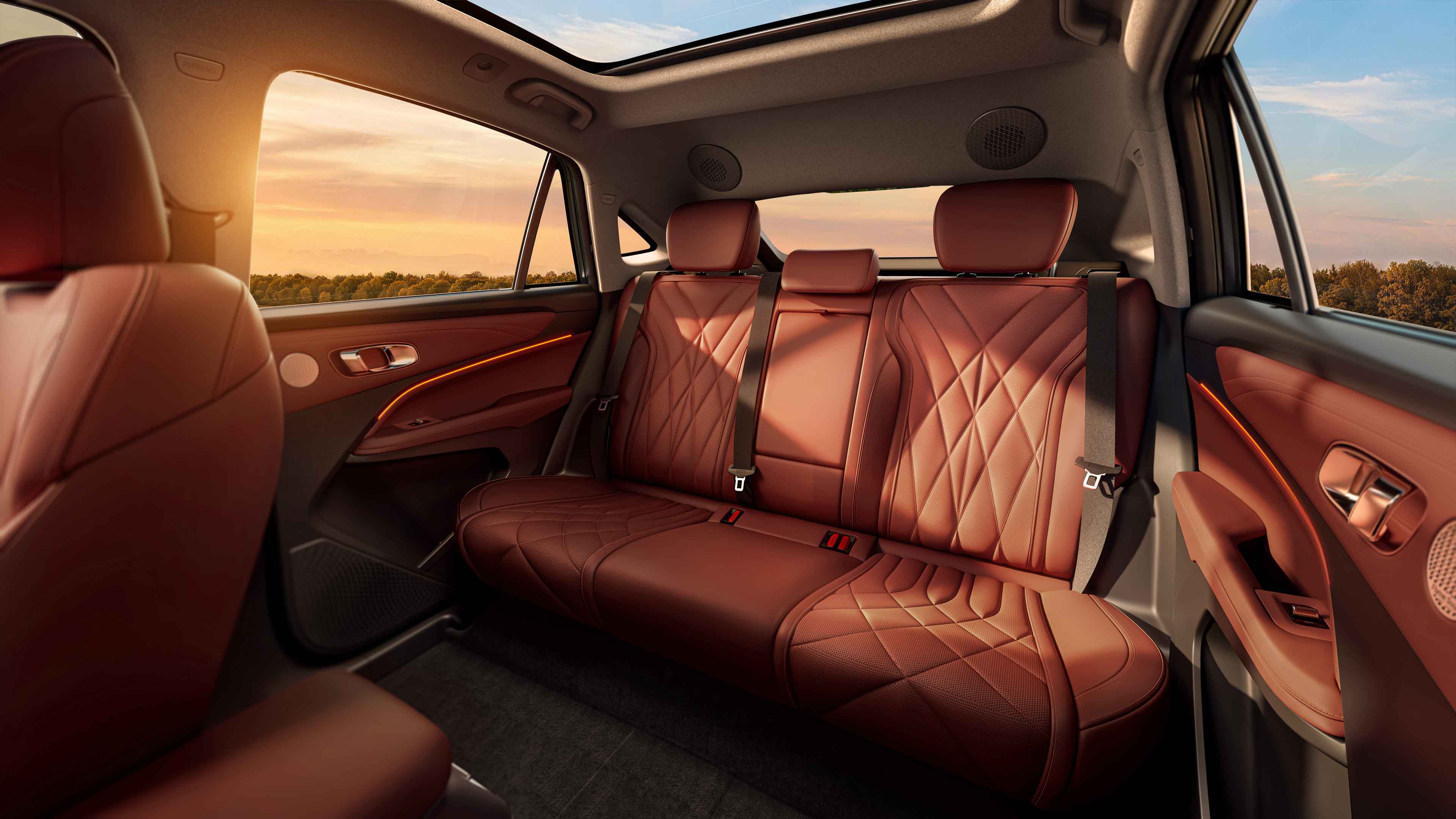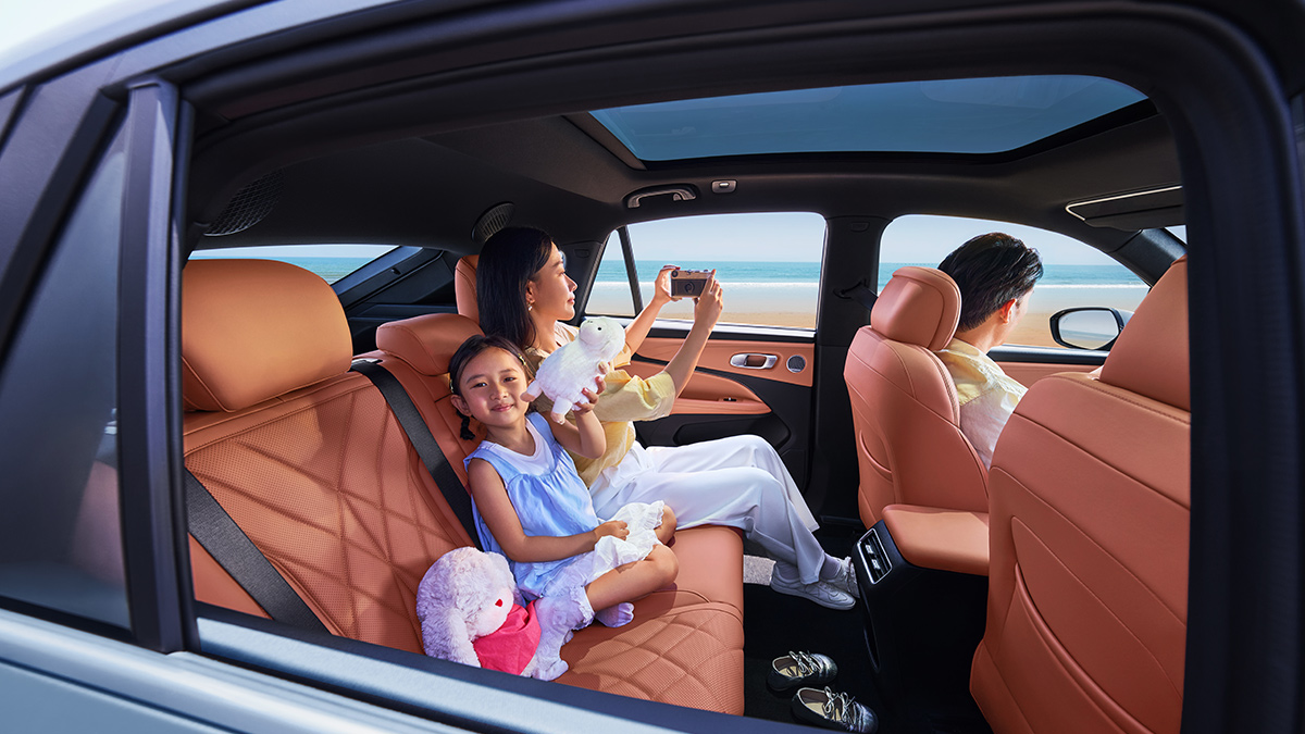 88.5%超大得房率,后排纯平地板,二排头部镂空设计,腿部空间975mm,宽敞坐姿超体面